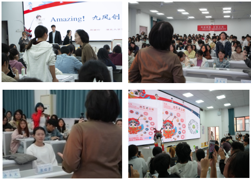 周丽玲教授结合亲身经历,讲述了她与湖北地方戏曲传播结缘到打造九凤IP的二十年探索历程,以及在非遗传承实践中落实习近平总书记关于中华优秀传统文化“创造性转化,创新性发展”重要指示精神的心得。学生们专注聆听、认真记录,对戏曲非遗文创产生了浓厚兴趣。