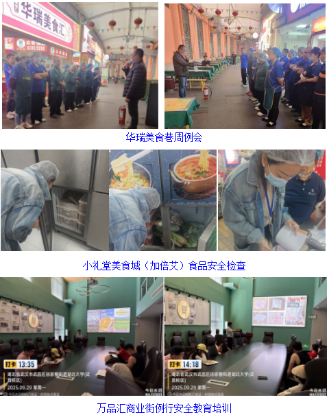 “食品安全,重于泰山。从细致消杀到严格巡查,从源头管控到理念宣导,我们力求把每一项简单的工作重复做好,在日复一日的坚守中筑牢食品安全的铜墙铁壁。”小礼堂美食城(加倍艾)区域现场负责人叶婷经理强调。下一步,公司将通过开展秋季安全教育培训与消防演练等活动,持续普及日常安全知识,不断提高公司员工与经营商户排查防控安全风险能力与突发应变能力,有效预防和减少各类事故的发生,公司总经理杜国雄强调。