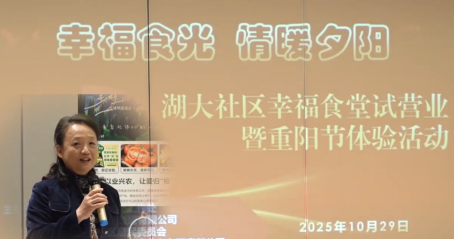 湖大老年协会、老教授协会会长刘星海作为老年代表发言,表达了老同志们对食堂开业的由衷喜悦与热切期待,他在发言中激动地说道:“今天有幸参加幸福食堂的开业活动,我们这些幸运时代的幸福老人,走进幸福食堂,分享幸福食光,享受幸福生活,在社会主义幸福大家庭中享受幸福晚年、幸福人生,祝大家幸福快乐!”资产公司副总经理许良发代表“情暖夕阳”志愿服务队全体队员庄严承诺,将以热情细致的服务为老年居民朋友守护这份“舌尖上的幸福”。现场还播放了公司全体党员向全体老同志致以重阳节日祝福的视频。