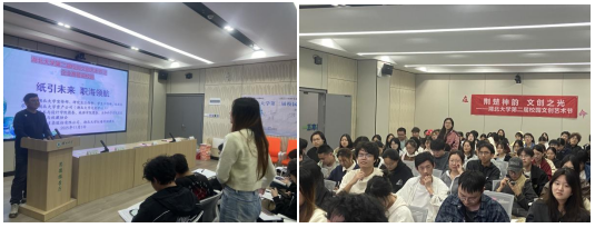 讲座前,潘祺彤一行还与学校学生发展与就业指导中心主任张丽娜、资产公司党组织书记杜风等进行了座谈交流,就进一步加强大学生职业规划、就业指导与文创合作、品牌打造等内容达成了新的共识。