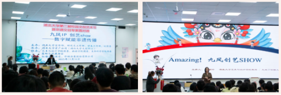 周教授现场展示了荆楚戏曲文创形象——九凤 IP 的多元创新成果,阐述了以“时代性、地方性、青年性”为核心的设计理念,详细介绍了她运用现代新媒体技术为戏曲文化赋能、打造湖北地方戏曲文创,让中华优秀传统文化在创新中焕发新生的心路历程。
