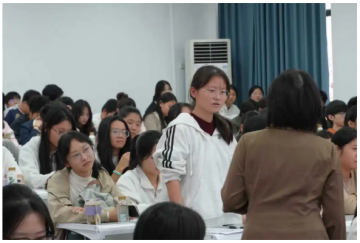 周丽玲教授结合亲身经历,讲述了她与湖北地方戏曲传播结缘到打造九凤IP的二十年探索历程,以及在非遗传承实践中落实习近平总书记关于中华优秀传统文化“创造性转化,创新性发展”重要指示的心得。学生们专注聆听、认真记录,对戏曲非遗文创产生了浓厚兴趣。